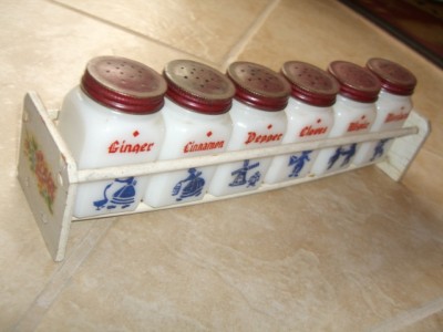 SET 6 MILK GLASS SPICE JARS-DOVE-FRANK TEA & SPICE CO.