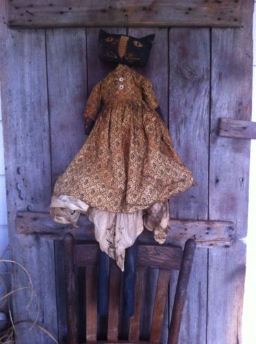 Title (ebay affiliate link): Primitive Folk Art Black Kitty Cat Doll 36" tall Civil War repro print dress