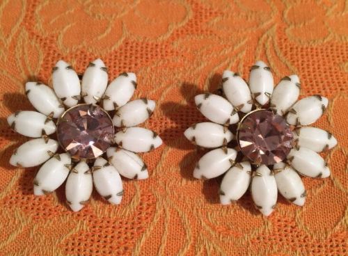 Title (ebay affiliate link): VINTAGE WEISS PINK & WHITE MILK GLASS RHINESTONE FLOWER EARRINGS