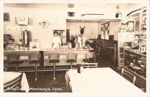 RPPC CITY CAFE MONTEAGLE, TN INTERIOR VIEW COCA COLA CLOCK CIGAR CASE