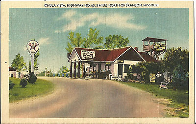 Title (ebay affiliate link): 1940S LINEN POST CARD, CHULA VISTA, BRANSON, MO. TEXACO GAS STATION, COCA COLA