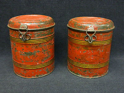 Early Pair Antique Red with Yellow Band Tole Kitchen Spice Canisters Locking Lid
