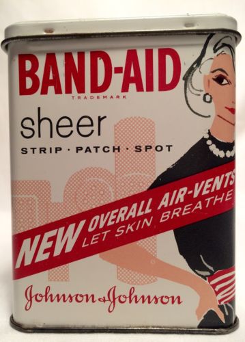 Title (ebay affiliate link): Vintage Early 1960s Johnson & Johnson MODERN WOMAN Sheer BAND-AID Metal TIN Box