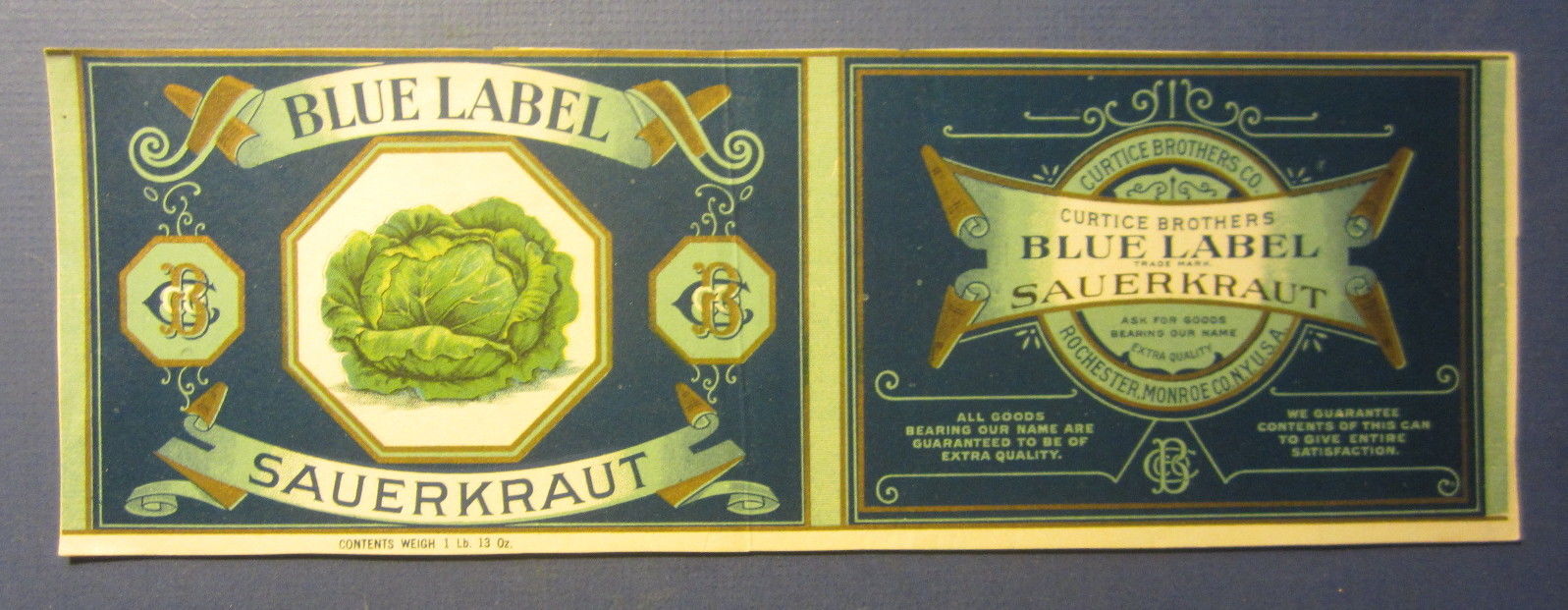 Title (ebay affiliate link): Old Vintage BLUE LABEL Sauerkraut Curtice Brothers Can LABEL- Rochester N.Y.