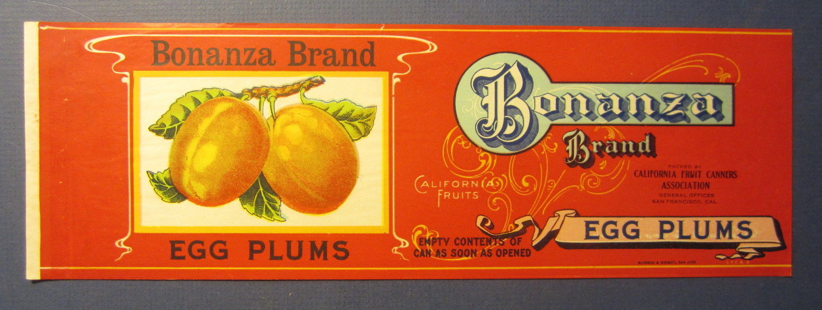 Title (ebay affiliate link): Old Vintage BONANZA Egg Plums Can LABEL- California Fruit Canners San Francisco