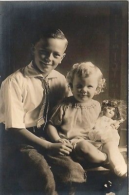 Antique Photo circa 1920 girl and boy with German bisque head doll