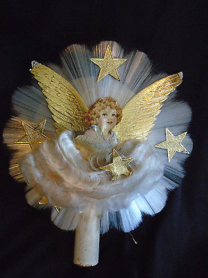 VINTAGE SPUN GLASS ANGLE TREE TOPPER "DRESDEN" STYLE WINGS + STARS