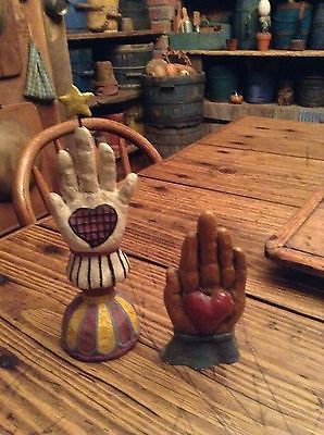 Early style folk art heart in hand shelf sitters primitive lot of 2