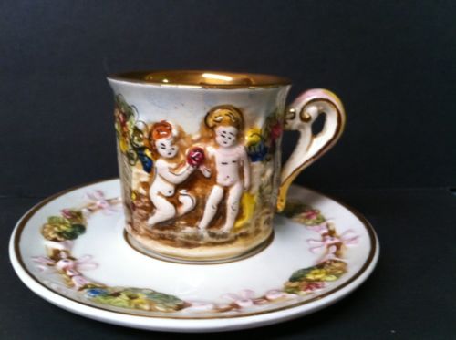 Title (ebay affiliate link): DEMITASSE CHOCOLATE CUP & SAUCER CROWN CAPODIMONTE ITALY GOLD CHERUB MAJOLICA