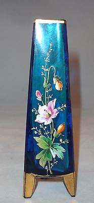 Three Sided Gilt Hand Painted Blue Bohemian Glass Vase