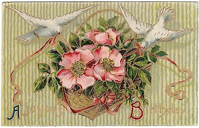 ANTIQUE 1910 A JOYOUS BIRTHDAY BASKET OF PINK FLOWERS WHITE DOVES POSTCARD