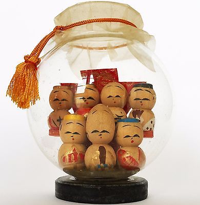 Kokeshi Seven Lucky Gods in the bottle Doll's Tall 2.5cm IZUMO Japan Antique XU4