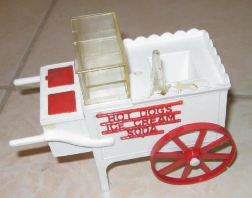 Title (ebay affiliate link): 1960s VINTAGE IDEAL TOYS HARD PLASTIC HOT DOGS ICE CREAM SODA VENDOR CART RARE