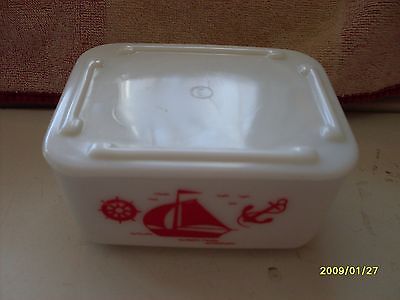 Nice vintage McKee milk glass with red ship, anchor & wheel refrigerator dish