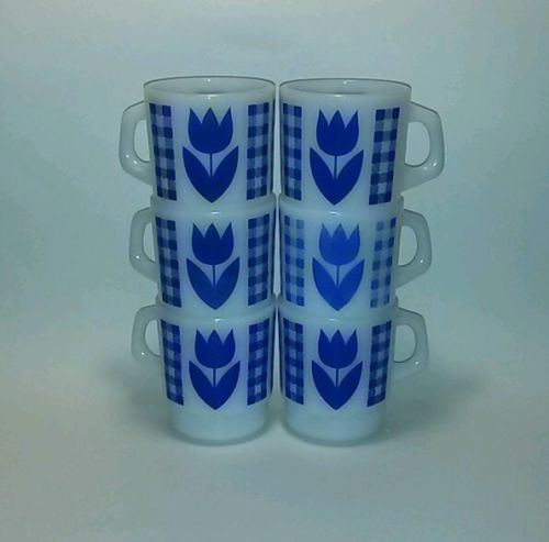Termocrisa Mugs Blue Tulips Stackable Vintage Milk Glass set of 4