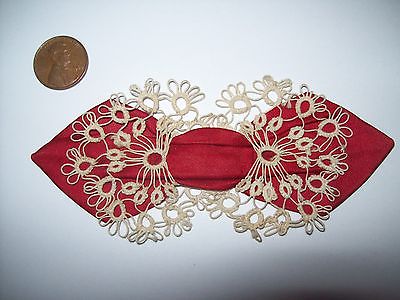 Sweet Vintage Antique Hand Tatted Ecru Lace & Red Satin Collar BowTatting Doll