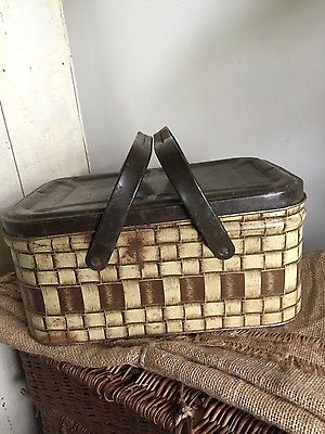 Title (ebay affiliate link): Early PRIMITIVE Brown & Yellow METAL Picnic Basket- MUST SEE