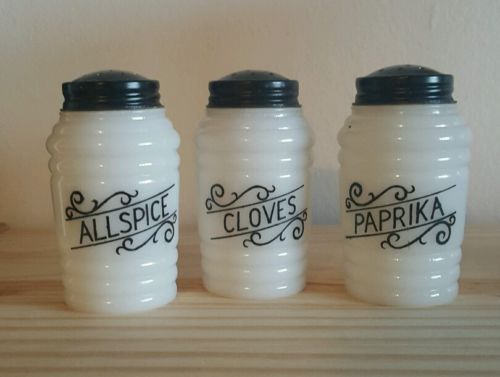 Title (ebay affiliate link): Rare Set 3 Black Script Art Deco Vtg Hazel Atlas milk glass shakers spice jars