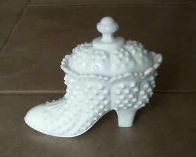 Title (ebay affiliate link): Fenton White Milk Glass Hobnail Boot with Lid Trinket or Candy Dish