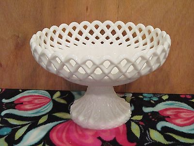 White Milk Glass Fruit Bowl Compote on Pedestal Lacy Edge