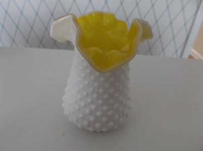 Title (ebay affiliate link): VINTAGE KANAWHA WHITE MILK GLASS HOBNAIL VASE*YELLOW INTERIOR*RUFFLED EDGE*RARE!