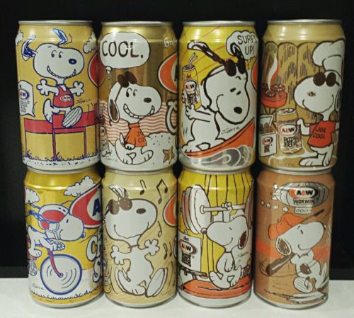 Complete Set 8 Snoopy A&W Root Beer Cream Soda Cans Peanuts Woodstock