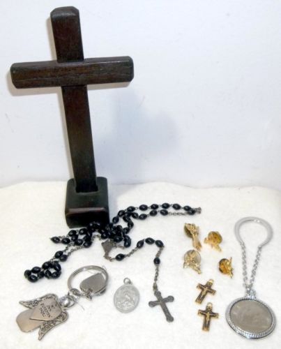 Title (ebay affiliate link): VINTAGE RELIGIOUS ITEMS LOT - WOOD CROSS, BEADED ROSARY, ANGEL PINS, KEY CHAINS