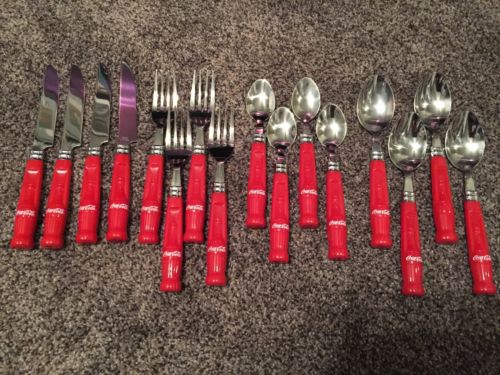 Title (ebay affiliate link): COCA COLA STAINLESS SILVER WARE WITH RED BOTTLE HANDLES 16 PIECE VINTAGE