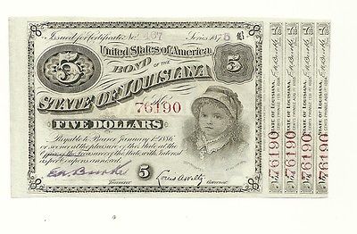 Post-Civil War $5.00 State of Louisiana "BABY BOND" 1870s UNC