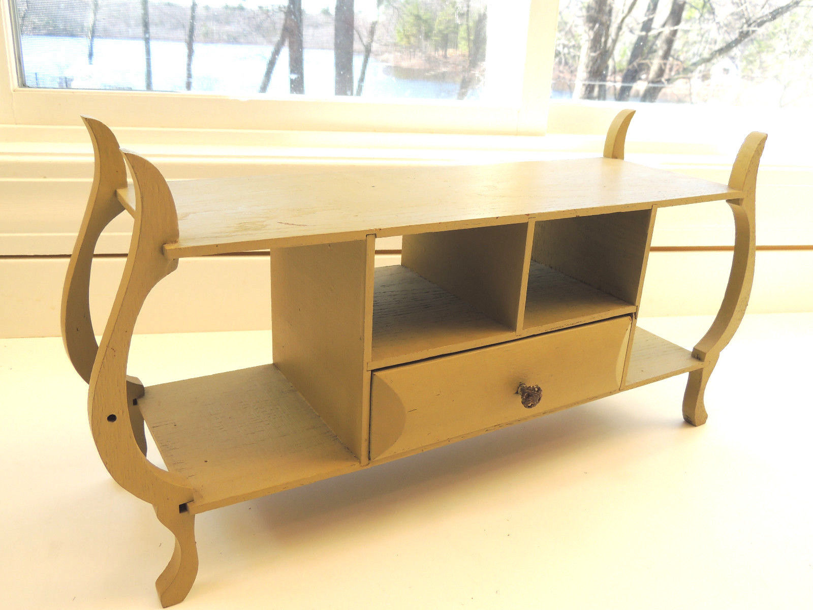 Title (ebay affiliate link): VINTAGE WOOD SHELF & DRAWER TABLE TOP PAINTED PALE GREEN