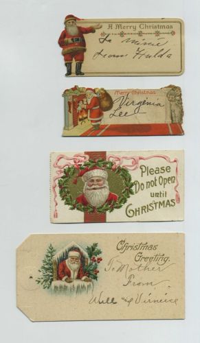 Title (ebay affiliate link): Lot (4) Vintage Christmas Greeting Gift Tags Santa Claus Red Suit Doll cv1609