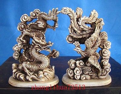 Antique Collectible Handmade Statue silver Cupronickel Dragon & phoenix Art Deco