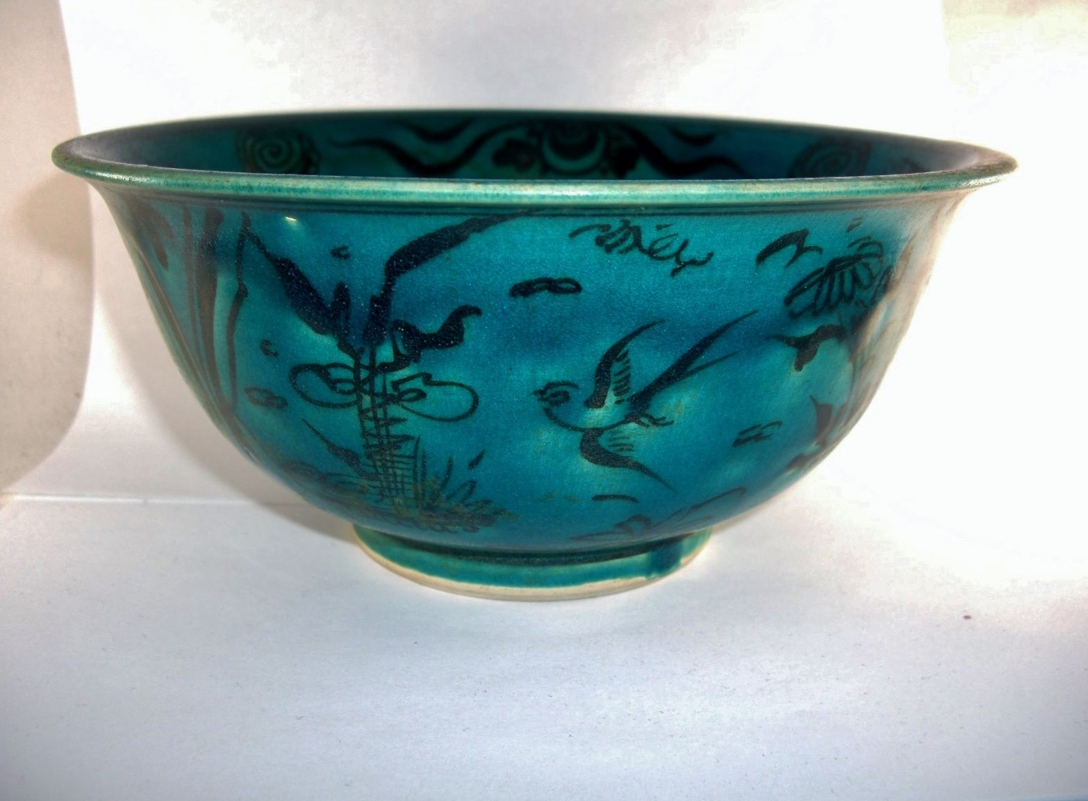Turquoise Pottery Ceramic Bowl Birds, Persian? Chinese? Antique