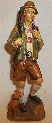 Vintage Carved & Painted Wood Black Forest German Alpine Man Hunter Smoking Pipe