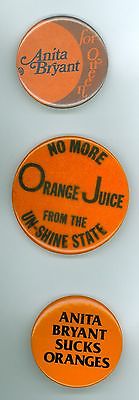 Title (ebay affiliate link): 3 Vintage 1977 Florida Gay Rights Political Cause Pinback Buttons Anita Bryant N