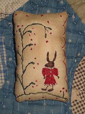 Primitive tiny Sampler Pillow *Folky Rabbit in Red Dress* Folk Art Needlework