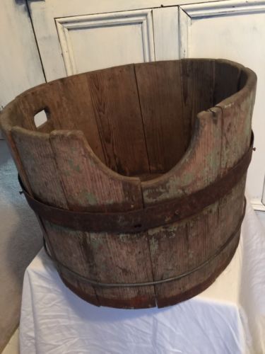 Title (ebay affiliate link): Antique Dry Primitive Vintage Wood Barrel Bushel Basket Bucket Farmhouse Green