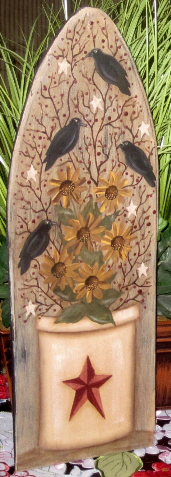 *~*PRIMITIVE*~* HP FOLK ART STAR CROCK * CROW * SUNFLOWERS * STARS *~* STRETCHER
