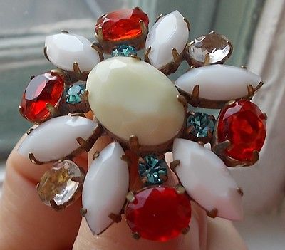 Title (ebay affiliate link): LARGE VINTAGE CZECH HANDMADE RHINESTONE BUTTON~MILK GLASS~RED~TEAL~CREAM