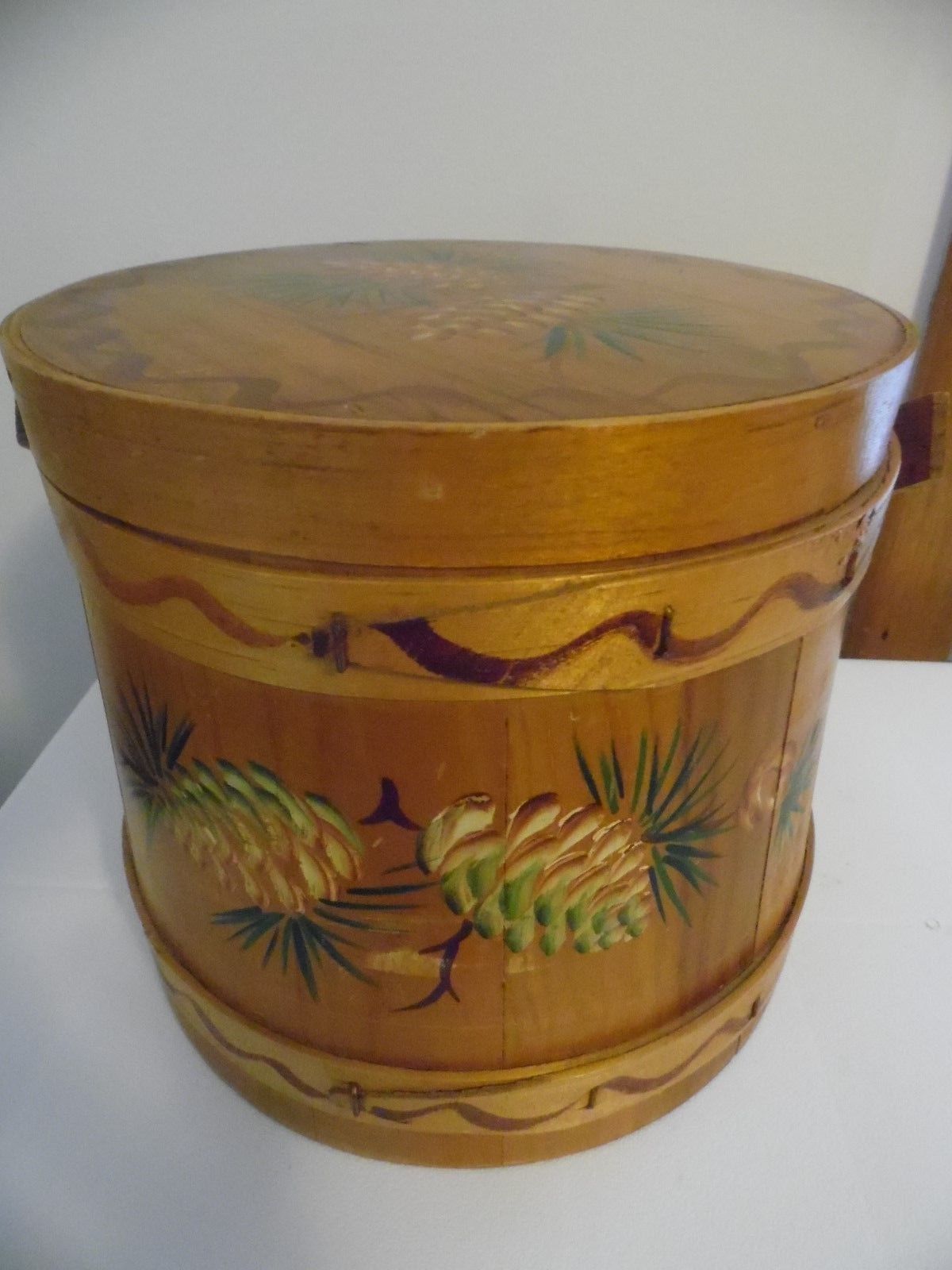 Woodcroftery Sugar Firkin Bucket w/Handle, Handpainted w/Pine Cones, 7-1/2" Tall
