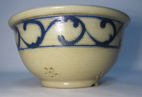 Wisconsin Pottery MEL Salt Glazed Stoneware Cobalt Decorated Strainer Bowl 2 yqz