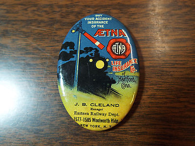 VINTAGE AETNA LIFE INSURANCE LOCOMOTIVE EASTERN RAILWAY NEW YORK POCKET MIRROR