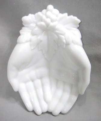 Title (ebay affiliate link): VTG WESTMORELAND OPEN HANDS WHITE MILK GLASS DISH GRAPES & LEAVES 1940'S-1950'S