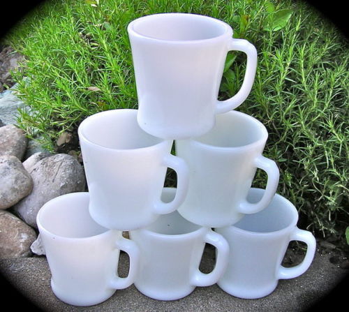 Title (ebay affiliate link): 6 Vintage Fire King Anchor Hocking White Milk Glass Coffee Mugs D Handle