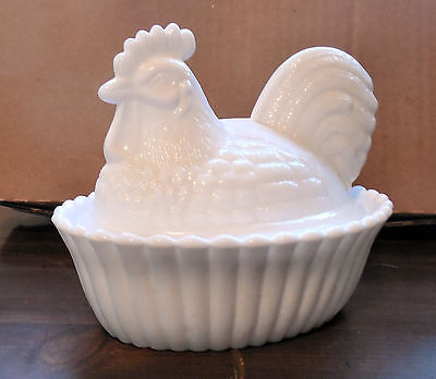 WESTMORELAND HEN ON NEST CANDY DISH WHITE MILK GLASS 6X4 CHICKEN