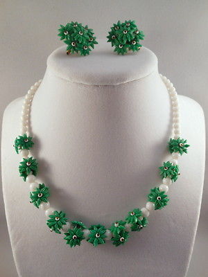 Title (ebay affiliate link): Vintage White Milk Glass Bead & Green Flower Cluster Necklace and Earrings Set