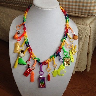 Title (ebay affiliate link): Vintage 80's Plastic Bell Necklace Abacus Stovetop baseball bat Retro Clip on