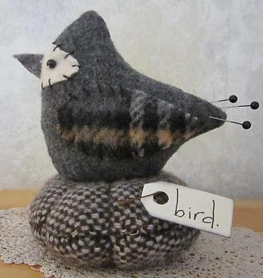 PRIMITIVE GRAY WOOL BIRD MAKE DO PIN CUSHION PFATT