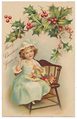 Ellen Clapsaddle - Girl Sewing Christmas Quilt Under Holly Trim