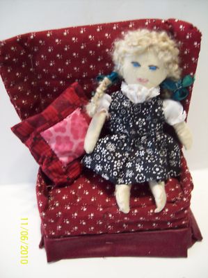Antique 6" Cloth Doll Handmade Folk Art + chair/pillow